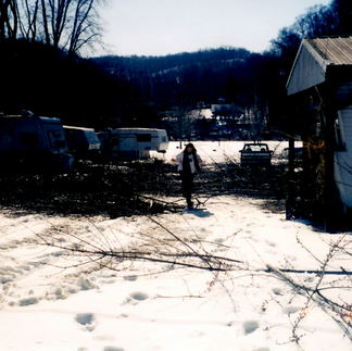 The corn crib that was turned into a cabin and later on ended up floating down the creek at Red Barn. Thankfully no visitors were inside and it wasn't rented that day! Younger couples with kids loved this option because it was next to the creek and set up to have family accommodations. Dennis said that it was 1-2 years after they sold the Red Barn. The corn crib was only 6-8 feet away from the stream, so when the stream flooded the crib went with it one time. "Apparently it looked like a fishing bobber going down the stream."